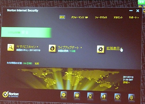 新製品は、ウイルススキャンを実施する「今すぐスキャン」、ウイルス定義やURLリストなどのプログラム更新を確認する「LiveUpdate」、詳細設定の画面に移動する「拡張表示」の3項目だけを表示するすっきりとしたメイン画面で使いやすさを追求した。ウイルススキャン・起動時のPC操作性は、2011年版と比べて20%軽くなっている。