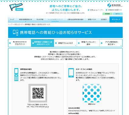 携帯電話への需給ひっ迫状況通知サービスの紹介ページ