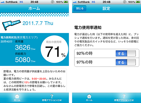 スマートフォン用アプリ「節電アクション」は、iPhone/iPod touch向けとAndroid端末向けを用意。電力需給逼迫時(使用率92%時・97%時)に、プッシュ通知の「節電アラーム」をリアルタイムで受信する。現在、東京電力管内の電力使用状況も確認でき、今後は過去の電力使用量をアーカイブする「節電カレンダー」機能などを追加する予定。