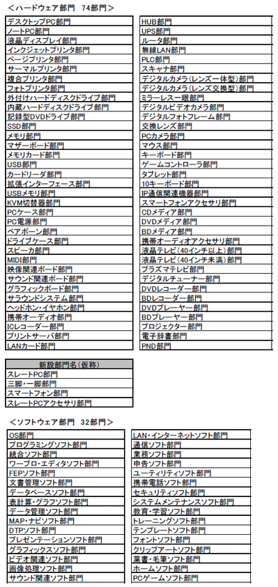 「BCN AWARD 2012」(集計期間2011年1月1日~12月31日)の対象部門一覧