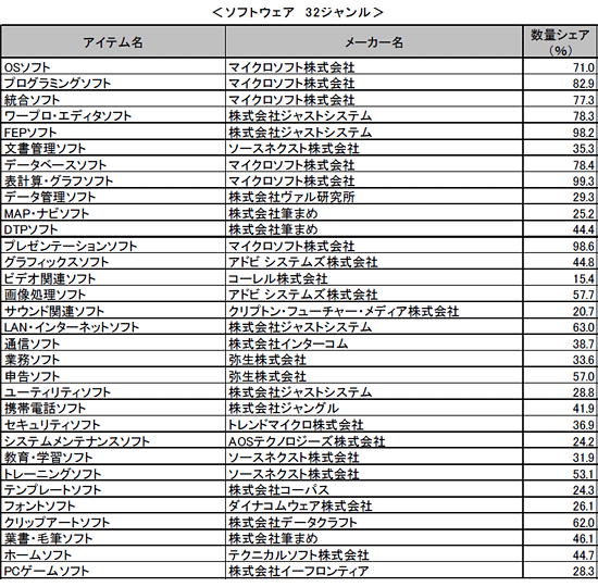 ソフトウェア部門では、ビデオ関連ソフト部門がコーレル、携帯電話ソフト部門がジャングル、ユーティリティソフト部門がジャストシステム。いずれも昨年「BCN AWARD 2011」を獲得したメーカーが、今年に入ってからもトップを維持している。
