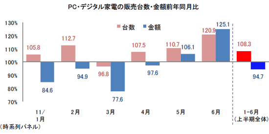 2011年上半期のPC・デジタル家電市場は、販売台数が前年同期の108.3%、販売金額が94.7%だった。震災の影響で、3月に台数で前年同月比96.8%、金額で77.6%の大幅減になったものの、4月以降は薄型テレビなどの地デジ化需要がけん引し、台数でプラスに転じた。6月には、台数で120.9%、金額で125.1%と拡大している。