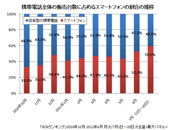 2011年6月の携帯電話全体の販売台数に占めるスマートフォンの割合は、前月5月の43.5%から9.4ポイント増え、52.9%に達した。ただ、スマートフォンの販売台数自体は、シェア48.1%で初めて4割を超えた2010年12月、今年3月、4月のほうが多く、従来型の携帯電話の販売台数が減少したため、相対的にスマートフォンの構成比が高まった。4割台突入から5割突破まで、ちょうど半年かかり、どちらも新製品の相次ぐ発売がきっかけだった。