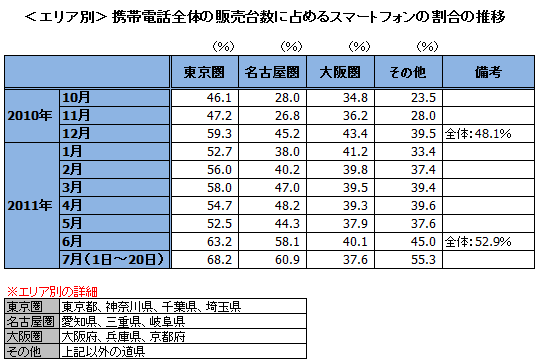 また、スマートフォンの割合の数値は、地域によってかなり異なり、四つの地域区分のうち、東京圏(東京都・神奈川県・千葉県・埼玉県)では、6月の時点で63.2%とすでに6割を超えているのに対し、名古屋圏(愛知県・三重県・岐阜県)は58.1%、大阪圏(大阪府・兵庫県・京都府)、その他(東京圏・大阪圏・名古屋圏に該当しないすべて)はともに40%台で5割未満だった。携帯電話全体の販売台数のうち、東京圏とその他がそれぞれ4割弱を占め、「東京圏」と「その他」での数字が全体を左右する。