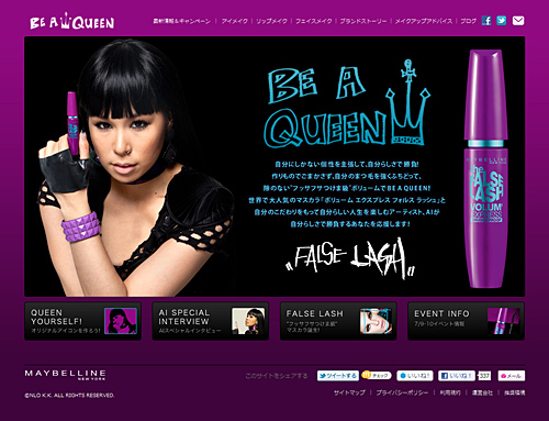 「QUEEN YOURSELF」は、「ボリューム エクスプレス フォルス ラッシュ」のウェブキャンペーンのイメージキャラクター、R&BシンガーのAIさんのオリジナルグラフィックでイラスト風にジェネレートし、この世に一つの「BE A QUEEN」なオリジナルアイコン画像を生成するジェネレータ。