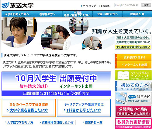 現在、2011年度2学期10月入学生を募集している。出願締め切りは、郵送・インターネット出願ともに8月31日。募集要項など、詳細はウェブサイトで公開している。