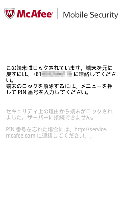 スマートフォンを紛失してしまったら、「McAfee Mobile Security」専用のホームページにアクセスし、まずはスマートフォンをロックしよう。画面をロックすれば、第三者がスマートフォンを操作することを止めることができる。このとき、スマートフォンを拾った人が連絡してくれるように、画面には「×××に連絡してください」というメッセージを表示する。