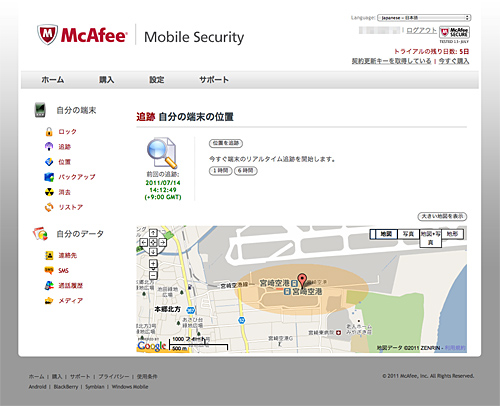 「McAfee Mobile Security」には、スマートフォンが今、どこにあるのかを通知する機能がある。場所を特定するには、サイトから「位置」メニューを選択し、「位置を追跡」のボタンをクリック。しばらく待つと、スマートフォンの現在位置が地図上に表示される。その地図を見れば、「昨日飲んだ店だ」「友人の家に忘れているんだ」といったことがわかる。