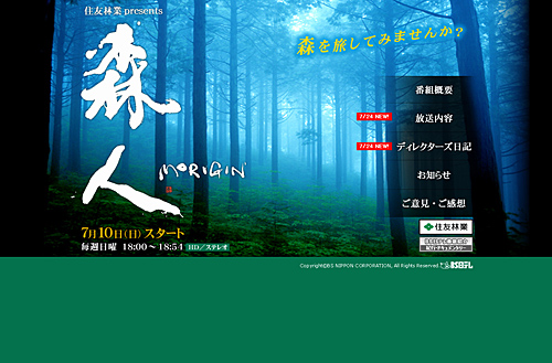「森人 MORIGIN」は、ナビゲーターの鶴田真由さんが、森を愛し、森を守る「森の人たち」と共に、日本の森の素晴らしさや人間と森との共生を考える番組。骨太なテーマをもつ一方で、「阿寒の森・北海道」「円山原生林・北海道」「八ヶ岳の森・山梨」や、世界遺産の「平泉」「小笠原諸島」「白神山地の森」「屋久島の森」「熊野古道の森」など、魅力的な観光地を紹介することで東日本大震災の影響で減少した観光客を呼び戻し、震災復興と経済活動の後押しをしたいと考えているという。