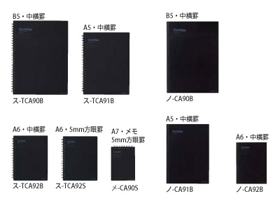 ラインアップは、ツインリングノート4種(中横罫のB5・A5・A6、5mm方眼罫のA6)、ツインリングメモ(5mm方眼罫のA7)、ノートブック3種(無線とじ・中横罫のB5・A5・A6)の計8種類。中紙はミシン目のあるカットオフタイプで、表紙色は黒。価格は210円~441円。