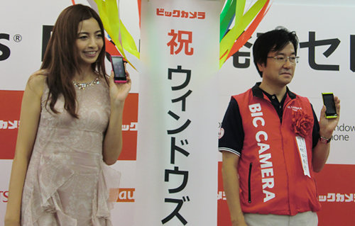 「Windows Phone IS12T」を手に持ってにこやかに笑う特別ゲストの片瀬那奈さん(左)と、日本マイクロソフトの樋口泰行社長(右)