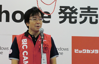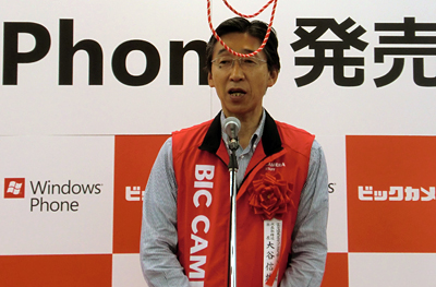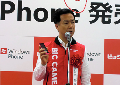 ビックカメラ有楽町店で実施された「Windows Phone IS12T by TOSHIBA」発売記念セレモニーでは、荒井文司店長の挨拶の後、日本マイクロソフトの樋口泰行社長、KDDIの牧俊夫執行役員商品統括本部長、富士通東芝モバイルコミュニケーションズ(富士通東芝モバイル)の大谷信雄社長が登場し、OS、キャリア、端末メーカー3社それぞれの立場から、日本初のWindows Phone搭載スマートフォン「IS12T」への意気込みを語った。