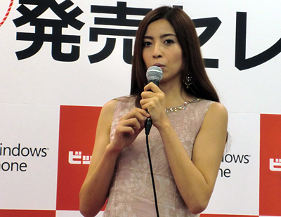 さらに、特別ゲストとして招かれたタレントの片瀬那奈さんが登場し、日本マイクロソフトの樋口社長が再び壇上に上がって「IS12T」の特徴を解説した。「IS12T」を昨日一日使ってみての感想として、片瀬那奈さんは、スマートフォンは難しいイメージがあったが、「かんたん、かわいい」「こんなにスマートフォンが使いやすくなったんだ」とコメント。色はピンク系のマゼンダが気に入った様子で、「気に入ったピンクがやっと出てきた感じ」と話した。最後に、片瀬那奈さんをはじめ5名でくす玉を割り、「IS12T」の発売を祝った。