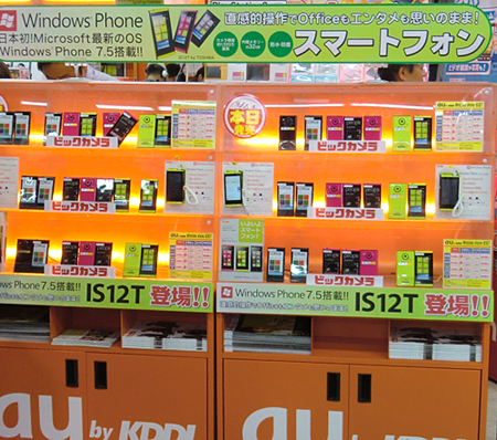 実機が多数用意された、ビックカメラ有楽町店内の「Windows Phone IS12T」コーナー