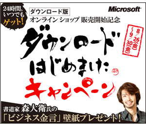 なお、ダウンロード版のオンラインショップでの販売開始を記念し、Microsoft Storeを含む各オンラインショップでダウンロード版を購入した全員に、書道家の森大衛さんの書による「ビジネス金言壁紙」をプレゼントするキャンペーンを実施する。期間は9月30日23時59分まで。