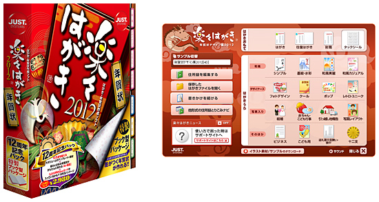 ジャストシステムは、業界トップクラスのイラスト、テンプレート、フォントを収録し、本格的な書道文字が書ける「Air書道」機能を搭載したハガキソフト「楽々はがき2012」を、9月2日に発売する。