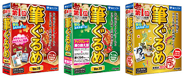 左から、筆ぐるめ Ver.19、筆ぐるめ Ver.19 アップグレード・乗り換え版、筆ぐるめ 年賀状2012 [辰]