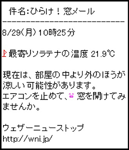 ウェザーニューズは、携帯電話向けサイト「ウェザーニュース」で、家の温度よりも外の気温が下がったらEメールで知らせるサービス「ひらけ!窓メール」の提供を開始した。
