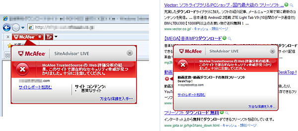 「マカフィー サイトアドバイザー ライブ」でリンク先の安全性をチェック
