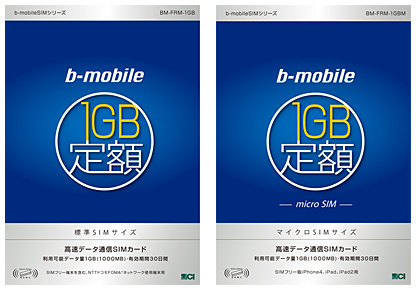 左から、「b-mobile Fair 1GB定額パッケージ」「b-mobile Fair 1GB定額パッケージ(マイクロSIM)」の製品パッケージ