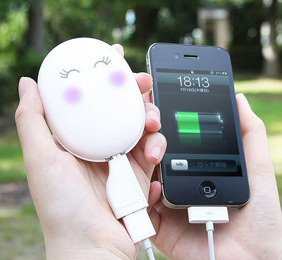 つやつやの白い本体と、ニコニコ笑顔が特徴のモバイルバッテリ。容量は1500mAh。付属の変換アダプタで、スマートフォンやMP3プレーヤーなど、USB充電に対応したさまざまな機器を充電することができる。本体前面を上にスライドすると、接続した機器への充電を開始する。