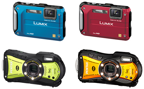 上から、「アウトドアモデル」で1位のパナソニック「LUMIX DMC-FT3」(スプラッシュブルー、スパーキーレッド)と2位の「Optio WG-1 GPS」(シャイニーオレンジ、グリーン)
