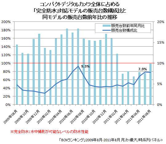 以前からあった完全防水仕様のコンパクトデジタルカメラだが、3年前の2008年8月の時点では、その売れ行きはコンパクトデジタルカメラ全体の月間販売台数のわずか3.0%に過ぎなかった。その後、2年前の2009年夏あたりから販売台数が伸びはじめ、販売台数に占める割合も若干上昇。1年のうち、特に7月とその前後の月に多く売れ、2010年7月には過去最高の9.3%を記録した。しかし、今年3月以降、前年の販売台数を下回るようになり、今年7月は全体の7.9%、8月は7.8%にとどまっている。とはいえ、主に夏の季節アイテムとして、一定のニーズがあることは間違いない。