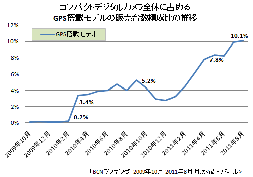 コンパクトデジタルカメラ全体の販売台数に占めるGPS搭載モデルの割合は、2011年1月はわずか3.2%に過ぎなかったが、今年3月以降、月を追うごとに増え、8月には10.1%と初めて1割を超えた。スマートフォンでは、ほとんどの機種がGPSを搭載しており、デジタルカメラでも搭載機種が増えてきた。予算や利用シーンに合わせて選びたい。(BCN・嵯峨野 芙美)