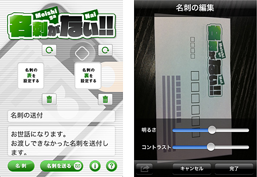iPhone/iPod touchの内蔵カメラで名刺をスキャンし、余白切り抜きや歪み補正、コントラスト調整の補正を行って、アプリ内に保存。「カメラロール」の登録画像取り込みにも対応する。名刺に挨拶文を添えて、メールを送ることができる。挨拶文や件名は、アプリ内で編集可能。