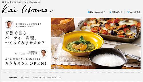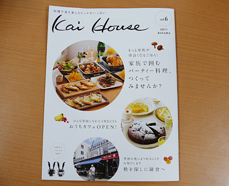 『Kai House』は、料理や食を楽しむヒントが詰まったキッチン&クッキング情報マガジン。家庭でできる簡単レシピや季節の食にまつわる情報を発信しながら、キッチンで活躍する貝印の製品を紹介。全国の料理教室や貝印の直営ショップなどで、無料で配布している。年4回の発行で、リニューアルした2011年秋号が第6号。制作には、マガジンハウスが協力している。