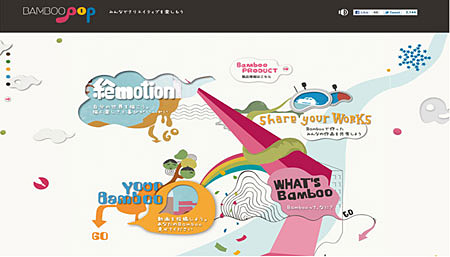 「Bamboo」シリーズのユーザーなどが、サイト内で絵を描いたり、作品を投稿したり、他のユーザーと作品を共有したりすることができる参加型ウェブサイト。「絵motion」「Share Your Works」「Your Bamboo」「What's Bamboo」のコーナーを用意している。