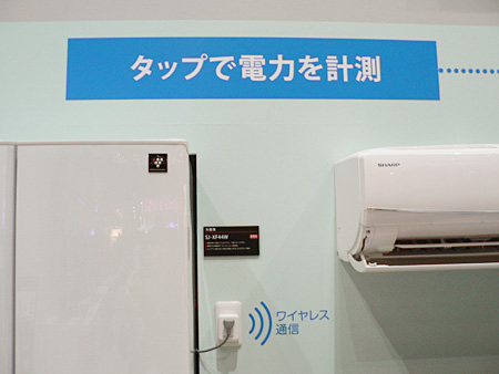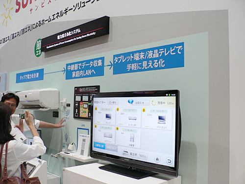 シャープのブースでは、フルハイビジョン(フルHD)の4倍の解像度をもつ「4K」液晶テレビや、家庭内の家電機器の消費電力を専用タブレット端末で確認できる「電力見える化システム」、家庭用蓄電池などのソーラー関連商品などを参考展示している。