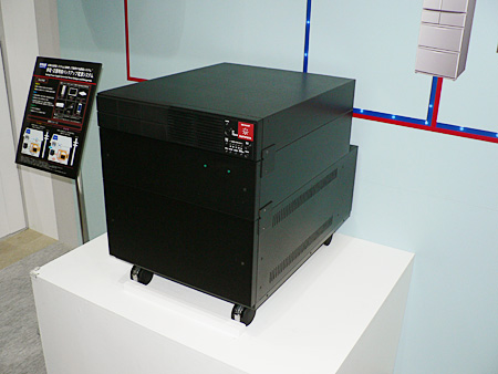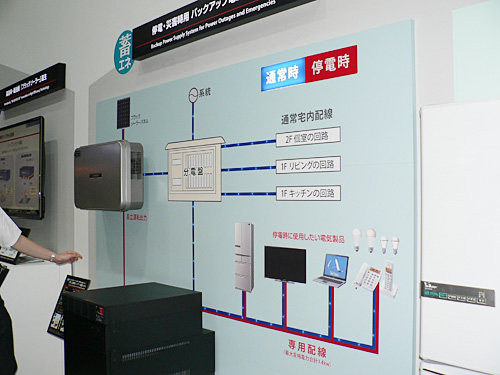 さらに、太陽光発電システムのオプションとして、家庭用蓄電池「停電・災害時用バックアップ電源システム」を展示。最新のホームエネルギーソリューションを提案している。