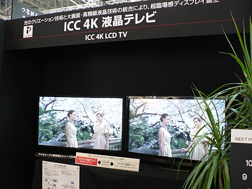 液晶テレビでは、フルHDの4倍の解像度(3840×2160)をもつ次世代の液晶テレビ「ICC 4K 液晶テレビ」を参考展示。パネル性能を最大限に引き出して、実際にその場にいるような映像を表現するI3研究所の信号処理技術「ICC」と、シャープの液晶技術を組み合わせた。来年度半ばの商品化を目指している。価格は未定。