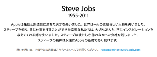 訃報を受け、米アップル(http://www.apple.com/)と日本のアップルのサイト(http://www.apple.com/jp/)は、ともにトップページをスティーブ・ジョブズ氏を追悼する特別バージョンに差し替え、「Appleは先見と創造性に満ちた天才を失いました。世界は一人の素晴らしい人物を失いました。スティーブを知り、共に仕事をすることができた幸運な私たちは、大切な友人と、常にインスピレーションを与えてくれる師を失いました。スティーブは彼にしか作れなかった会社を残しました。スティーブの精神は永遠にAppleの基礎であり続けます。」という追悼メッセージを掲載した。また、メールでスティーブ・ジョブズ氏への思いやお悔やみの言葉などのメッセージを受け付けている。