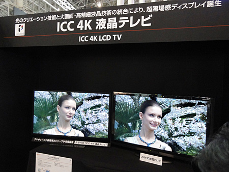 ICC 4Kテレビと普通のHDテレビを並べて展示するシャープのブース。映像の違いがはっきりわかる。フルHD映像はこんなに荒かったのか