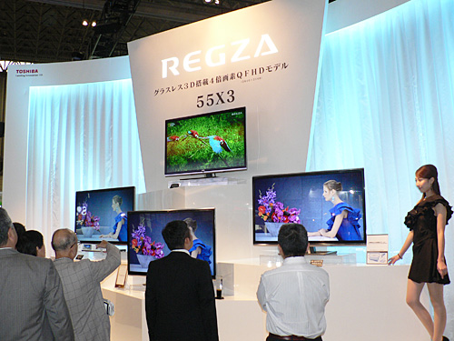 東芝ブースには、フルHDの約4倍の829万(3840×2160)画素の解像度をもつパネルを搭載し、55インチの大画面で専用メガネなしで3D映像が視聴できる液晶テレビ「REGZA 55X3」や、6チャンネル分の地上デジタル放送を毎日録画して一時保管することができる「タイムシフトマシン」搭載のBDレコーダー新製品を展示。人々の注目を集めている。