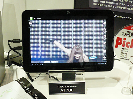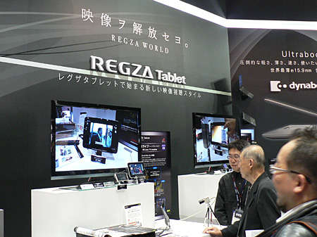 ブースでは、「映像ヲ解放セヨ。」をテーマに、「レグザタブレット」で始まる新しい映像視聴スタイルを提案。10.1型世界最薄・最軽量のAndroid 3.2搭載タブレット端末「AT700/35D」とBDレコーダー「レグザブルーレイ」新製品との連携によって、レコーダーのチューナーを使って放送中の番組をタブレットで見たり、録画番組をダビングして視聴したりなど、利用シーンをアピールしている。