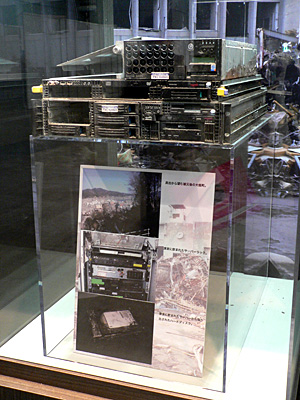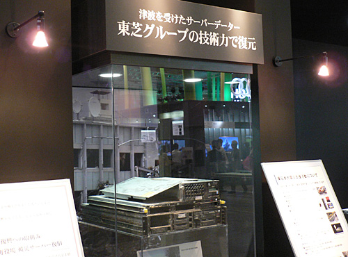 シアター近くには、東日本大震災で被災した東芝グループのサーバーを展示。これは東芝グループが岩手県大槌町町役場に納入したもので、住民データなどが格納されていたサーバーだ。海水に飲み込まれたが、義援金や被災者生活再建支援金の受給、災害援護資金の融資申請などに必要な住民データなどを無事復旧できたことを伝えている。