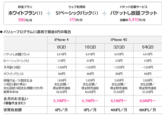 料金プランは従来と同じ。月額4410円で使い放題のパケット定額制プラン「バリュープログラム(i)」、最低月額1029円から上限4410円まで、使ったパケット量に応じて支払い金額が変わるパケット定額制プラン「標準プライスプラン」を用意し、契約時にどちらかを選ぶ。通話の基本料金プランのほか、月額315円の「S!ベーシックパック(i)」への加入が必要。そのほか、各種割引サービスを併用できる。