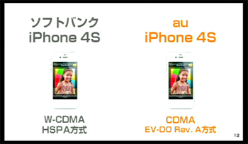 iPhoneシリーズは、国内では初代モデルとなるiPhone 3GからiPhone 3GS、iPhone 4まで、ソフトバンクモバイルが独占販売していたが、「iPhone 4S」はKDDI(au)も取り扱い、同日に発売する。ただし、通信方式の規格が異なるため、ソフトバンクモバイル版はiPhone 4より速い下り最大14.4Mbps、上り5.7Mbpsの速度で通信できる。