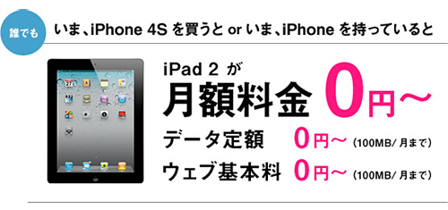 「アレ コレ ソレ キャンペーン」は、新規か機種変更でiPhoneを購入し、同時に新規でiPad 2 Wi-Fi + 3Gモデルを購入すると、iPad 2 3Gモデルを月額0円から利用できる「(iPad専用)ゼロから定額プラン」に加入でき、契約事務手数料も無料になるというもの。新規購入だけではなく、iPhoneユーザーがキャンペーン期間中にiPad 2を新規購入する場合も適用される。