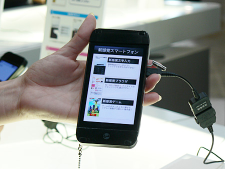 国内最大の電機/ITの総合見本市「CEATEC JAPAN 2011」。KDDIのブースでは、開発中のスマートフォン「新聴覚スマートフォン」に人気が集まっている。