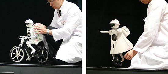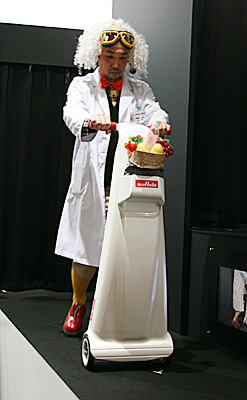 お茶の間でもおなじみのムラタセイサク君とムラタセイコちゃんは、CEATECでも愛嬌を振りまいている。二人は、村田製作所のマスコット兼最先端技術ロボット。ジャイロセンサで揺れを検知し、胸の円盤を回転させバランスを取っている。この“倒れない技術”を応用し、今年は電動歩行アシストカーを発表した。高齢者の安全な歩行や、重い荷物の運搬を助けてくれる。