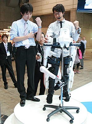 来場者が「HAL」を装着し、行われたデモンストレーションでは、来場者の腕に付けたセンサとデモ機の片足をつなげ、腕の曲げ伸ばしに反応する「HAL」を披露した。「HAL」はすでに一部医療・福祉機関で、高齢者や障害者のリハビリや身体機能支援に使われている。