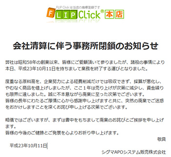 シグマA・P・Oシステム販売は、直販サイト「FlipClick」を閉鎖し、同サイト上で、2011年10月11日付で業務を終了したと発表した。