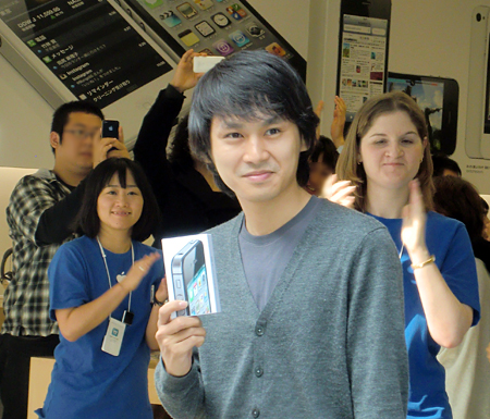列の先頭に並んだ男性は、10月11日の朝10時から並んで待っていたという。購入したのは、KDDI版の「iPhone 4S」16GBモデル(ブラック)。新規契約だったが、KDDI側のシステムに何らかのトラブルがあったらしく、「だいぶ待たされた」と苦笑していた。