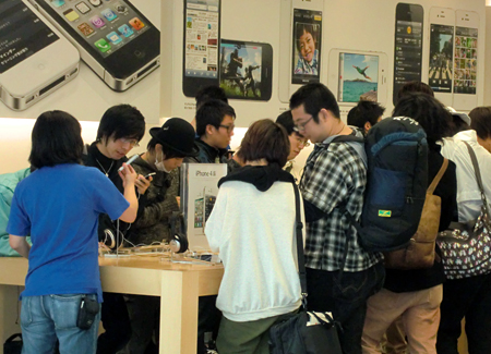 10月14日、ソフトバンクモバイルとKDDIは、アップル製スマートフォン「iPhone 4S」を発売した。東京・銀座にあるアップル直営店「Apple Store Ginza」では、同日午前8時から「iPhone 4S」の販売を開始。8時のオープンには約800人が並び、その後も続々と「iPhone 4S」購入待ちの列に加わっていった。