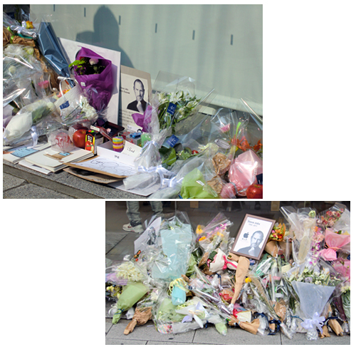 入口の両脇には、故スティーブ・ジョブズ氏を偲ぶ献花や品物が今もなお添えられている