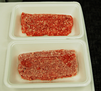 普通に冷凍した肉と(下)と「切れちゃう瞬冷凍」で冷凍した肉(上)